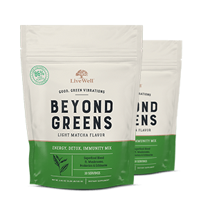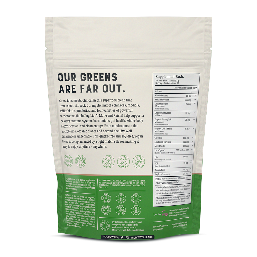 Our greens are far out. Conscious meets clinical in this potent superfood blend that transcends the rest. Our mystic mix of echinacea, rhodiola, milk thistle, probiotics, and four varieties of powerful mushrooms (including Lion’s Mane and Reishi) can help support a healthy immune system, harmonious gut health, whole-body detoxification, and clean energy. From mushrooms to the microbiome, organic plants to probiotics and beyond, the LiveWell difference is undeniable. A little goes a long way in this concentrated, gluten-free, soy-free, vegan blend, complemented by a light matcha flavor.
